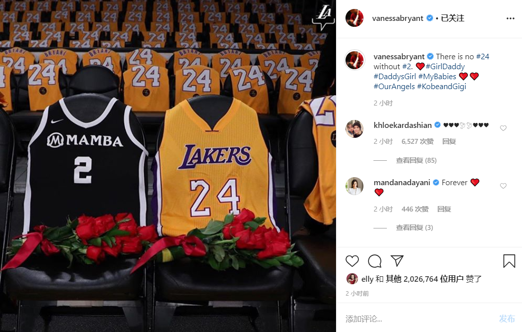 2月1日下午,科比妻子瓦妮莎在个人社交平台晒出了最新动态,今天NBA的常规赛照常举行,瓦妮莎晒出了24号和2号球衣来纪念自己的丈夫和女儿,并且配文“There is no#24without #2”(没有2就没有24),看到这里不禁让人泪