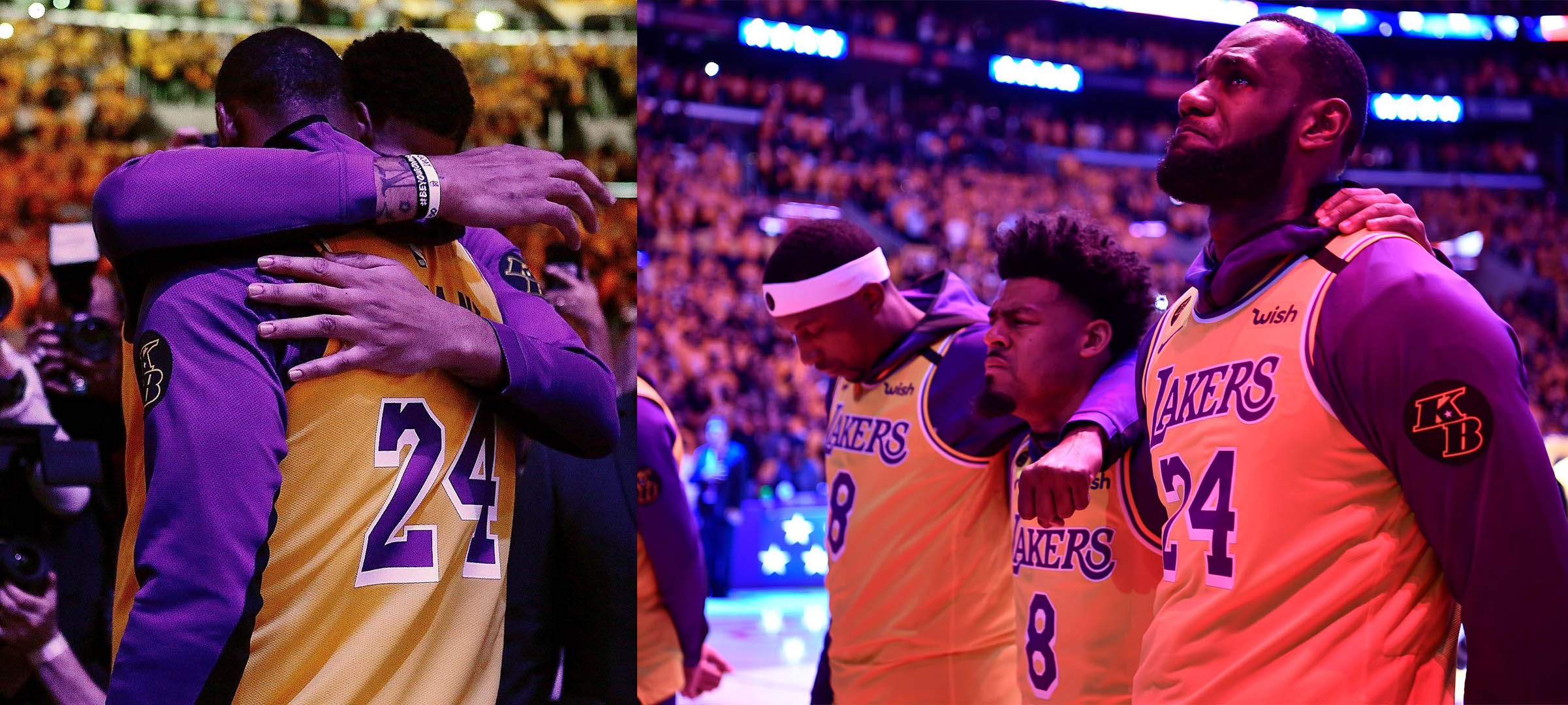 科比和女儿的不幸离世依然让人沉浸在悲痛中,在今天湖人队回到洛杉矶主场作战,全体球员用自己独特的方式纪念科比,穿上8号和24号球衣,全员都哭成了泪人,昔日的好友詹姆斯更是泪流不止。