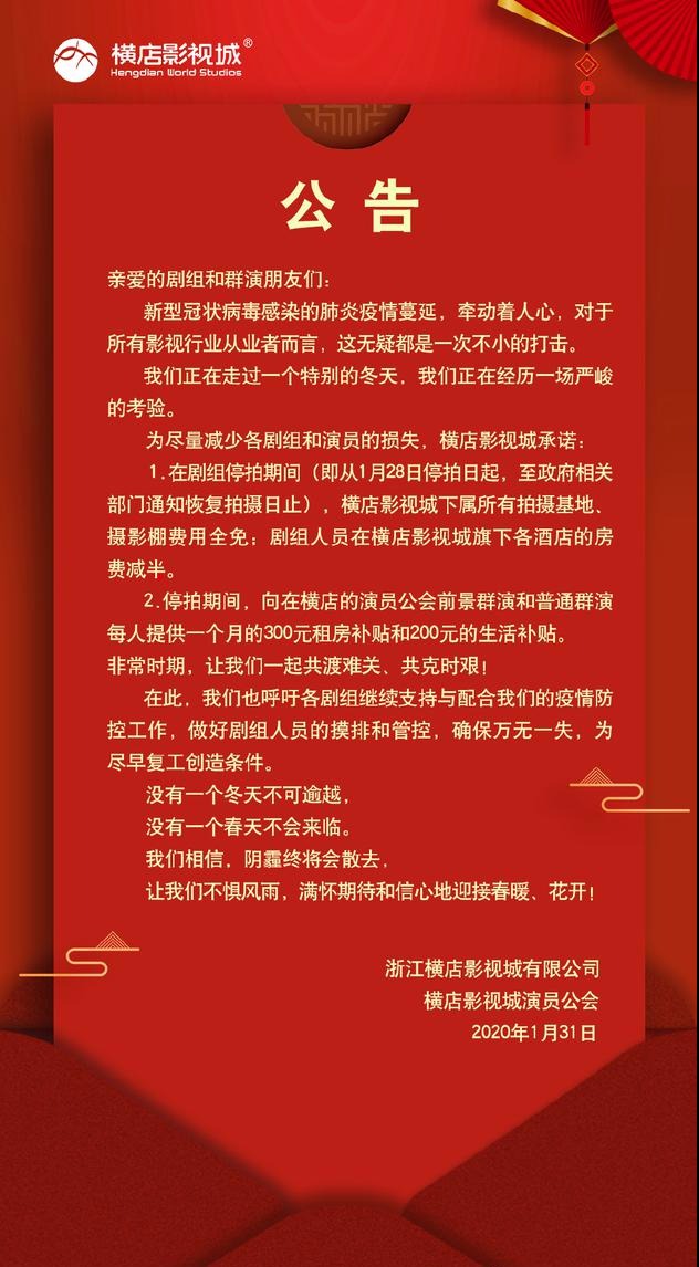 2月1日,横店影视城发布公告,称为尽量减少各剧组和演员的损失,横店影城承诺在剧组停拍期间,下属所有拍摄基地、摄影棚费用全免,剧组在横店影视城旗下各酒店的费用减半。