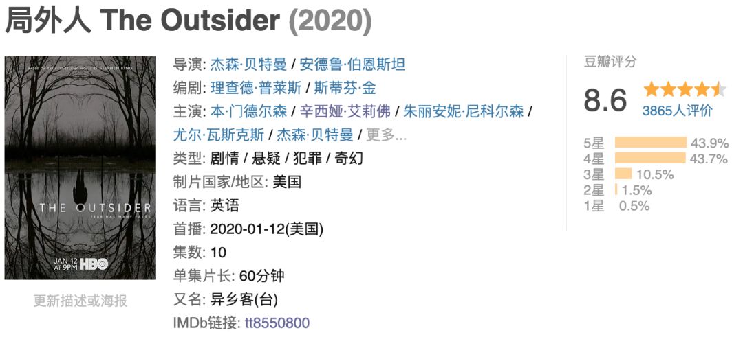 PS:这部HBO出品的剧集,最适合的打开方式,就是“养肥”了再看,不然一周一集地追,真太熬人了。所以,即将更新第五集的《局外人》,正是入坑的好时候。又或者你还有存货,那等10集全上线了再看,也未尝不可~
