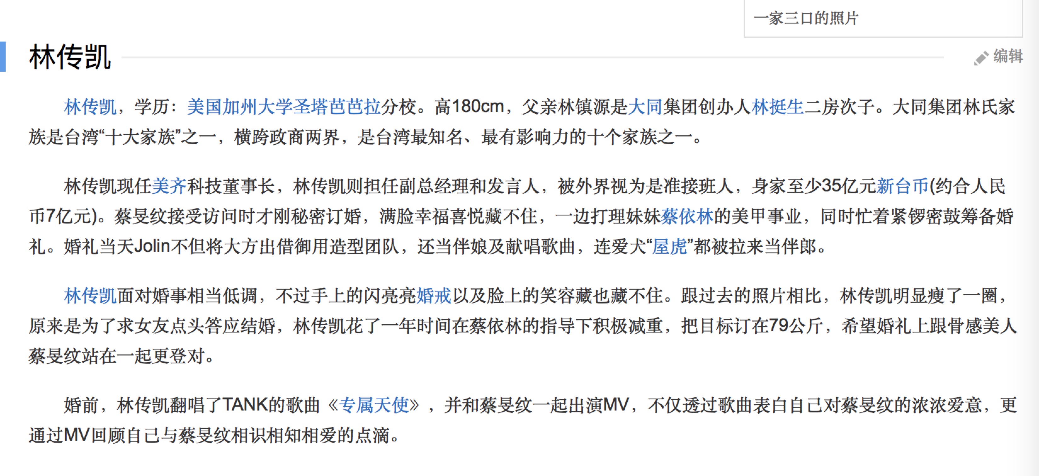 蔡旻纹的丈夫林传凯也是大有来头,他是台湾大同集团的第三代继承人,林氏家族更是台湾知名的“十大家族”之一,其本人被视为家族的准接班人,身价如今已经高达35亿新台币(约合人民币7亿)。