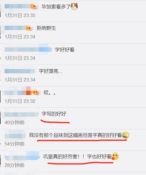 但更多的网友却是表示:虽然自己没有品味到这幅画,但巩俐的字真的好好看。原来,网友都被巩俐落款时标注小孩子说的那段字给吸引住了。不得不说,巩俐写的字真的很漂亮,仿佛画跟字并不是一个人写的,果然是人美字正心善。