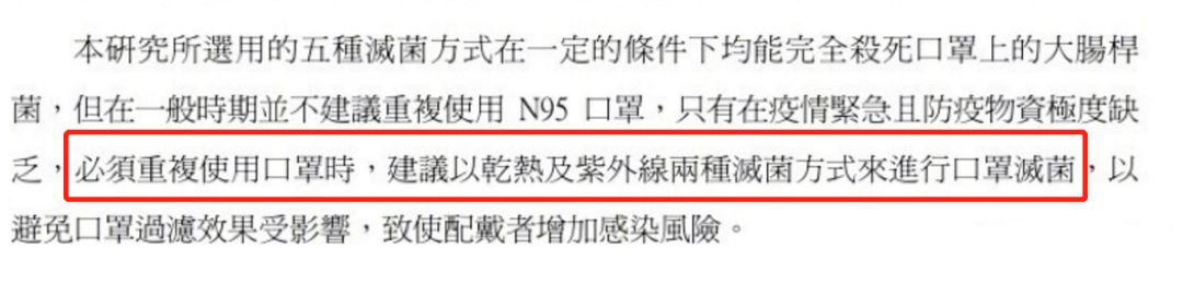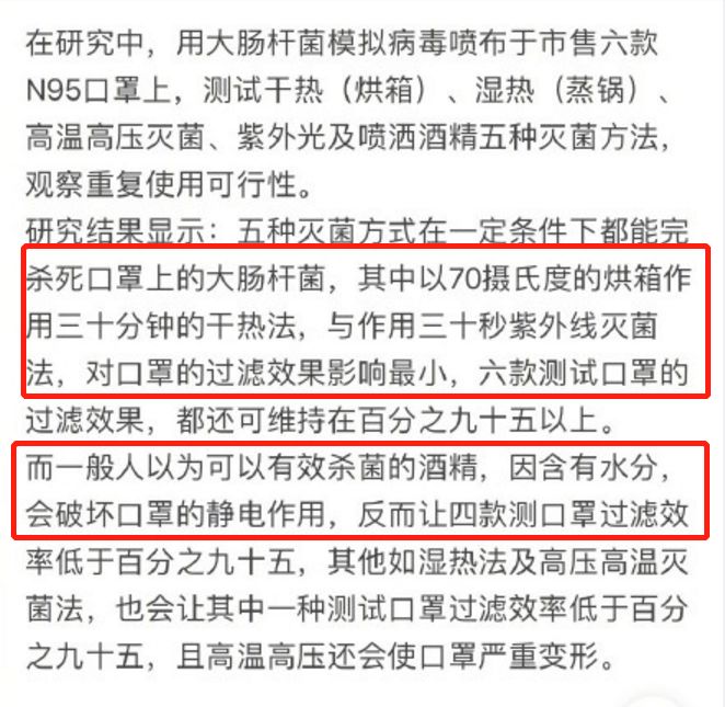 至于网传的酒精喷洒口罩消毒方法有没有效,在台湾研究所的结论中表示,酒精喷洒可能会降低口罩过滤效果。比较建议的两种方法是:烘箱设定70度干烘半小时,或者紫外灯照射杀菌半分钟。