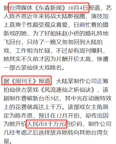 当时那部《风流逐仙之斩仙诀》制作费是新台币五亿元。按照今天的汇率,一亿元台币大概是两千多万人民币。陈乔恩当时的要价是八千万人民币,所以制作公司选择放弃了她。