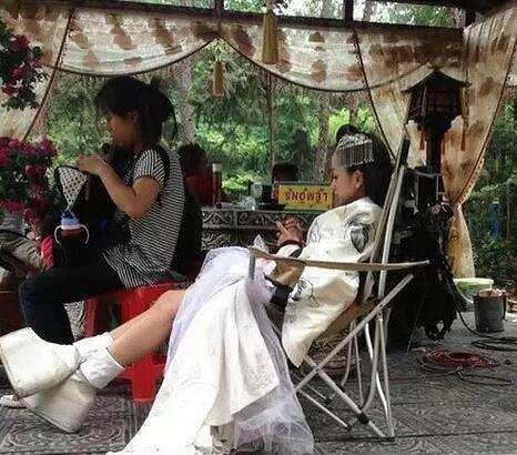 拍古装的时候还穿了超厚的鞋底,像是踩高跷。