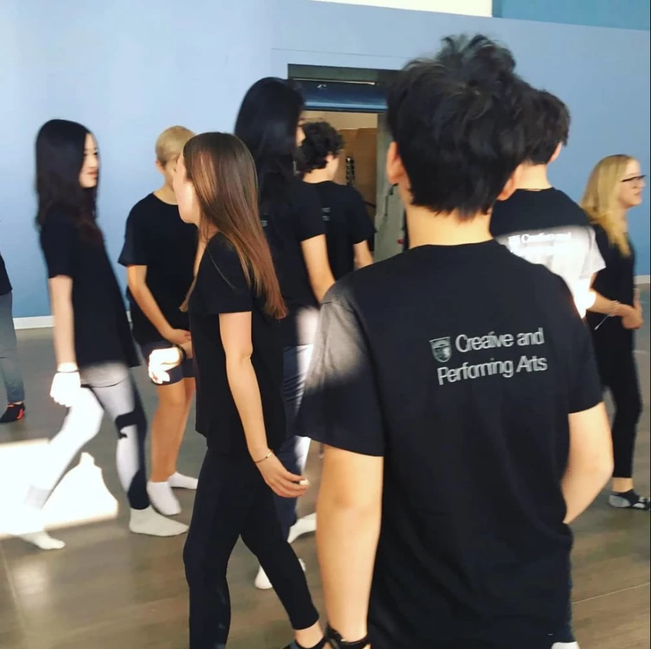 只见李嫣穿着学校发的统一黑色T恤配上黑裤子和白袜子,非常低调地站在后排,学习态度相当认真。