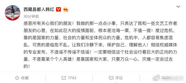31日,韩红发文回应,表示自己做的小事在巨大的疫情面前,根本是沧海一粟、不值一提,“度过危机,靠的是国家、社会和全体民众的力量”,她还呼吁大家不造谣不传谣不信谣,相信社会运行着正向的力量,“只要万众一心,灾难一定会过去!”
