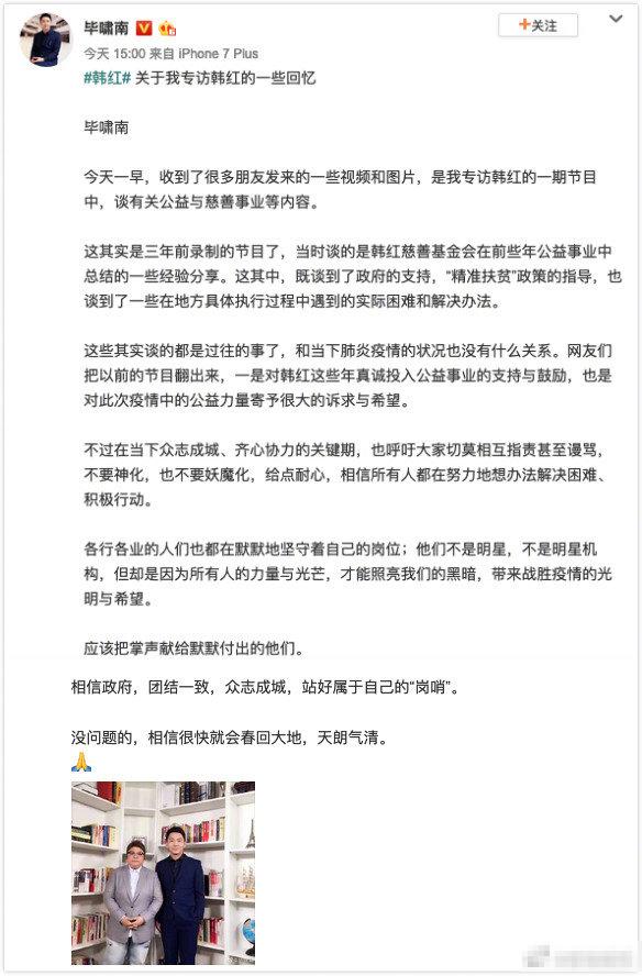 31日,当年采访韩红的主持人毕啸南也发文谈该期节目,称网友把节目翻出来,是因为对此次疫情的公益力量寄予很大的希望,他呼吁大家给点耐心,“切莫相互指责甚至谩骂,不要神化,也不要妖魔化”,各行各业的人都在坚守自己的岗位,应该把掌声给默默付出的他们。