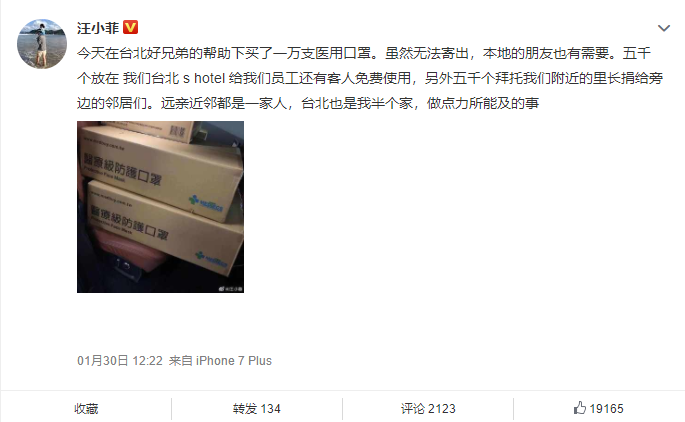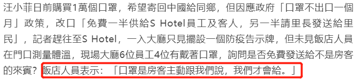 1月31日,据台媒报道,汪小菲捐赠1万个口罩有了后续的跟踪走访,有记者在汪小菲旗下的酒店走访发现,口罩并不是免费发放给不是房客的来宾,而是“房客主动跟我们说,我们才会给