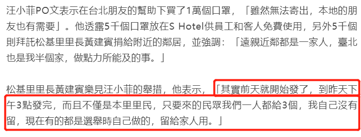 汪小菲在之前发文表示,自己在台北朋友的帮助下,购买了一万个口罩,虽然没办法寄出,但是考虑到本地的朋友也需要,所以大方的留了5000个口罩放在酒店供员工和客人免费使用,另外5000个则送给了附近的邻居。