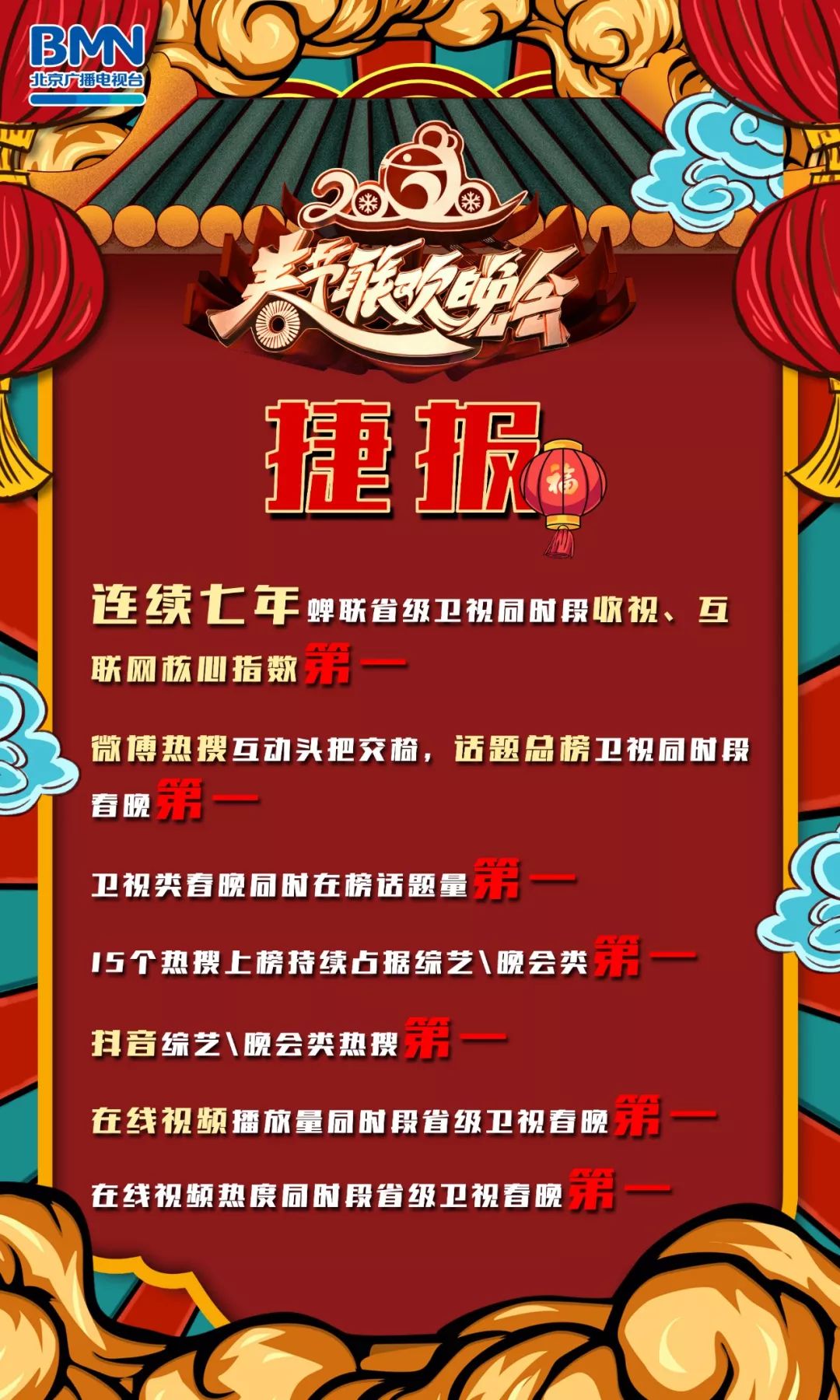 目前,各大卫视的春晚成绩单渐次出炉,2020北京台春晚再度艳压群芳,拔得头筹。索福瑞数据显示,2020年北京广播电视台春晚全国35测量仪城市收视率为2.94%,全国59测量仪城市收视率为2.7%,2020年北京台春晚索福瑞35城、59城收视率排名所有省级卫视春晚第一,连续七年蝉联省级卫视同时段冠军。据尼尔森网联全国城镇地区大数据显示,2020年北京广播电视台春节联欢晚会收视率2.627%,排名省级卫视第一。