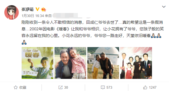 张妍在微博里表示“希望田成仁爷爷去世是一条假消息“”您孩子般的笑容永远留在我的心里。小花永远的爷爷,爷爷您一路走好,天堂依旧暖春“。