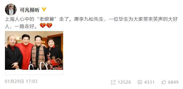 1月29日,主持人曹可凡在微博爆料,86岁的知名曲艺家李九松不幸去世。