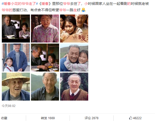 如今,他溘然离世,无不让人扼腕痛惜,两版《暖春》里饰演小花的女演员张妍(更名张洢萌)和齐如意都发文悼念。