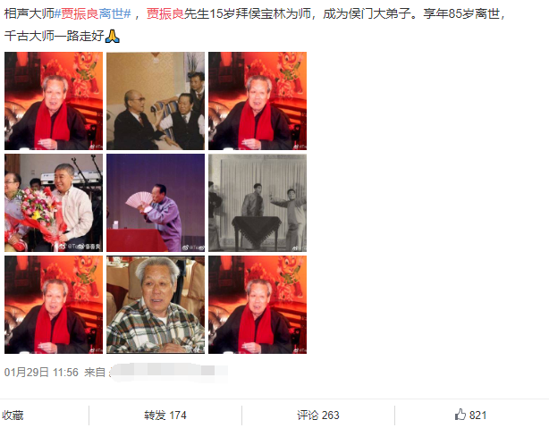 87岁贾振良去世的消息源自侯耀华的儿子、相声演员侯军,他在微博发文称”振良大爷从小就来到侯家,爷爷视如己出的大弟子,优秀的相声传承者,教育者走了,永远怀念!一路走好!”。