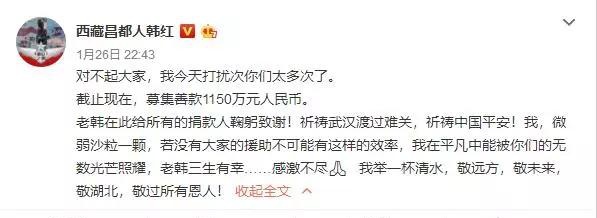 而似乎早被人们遗忘的韩红,也第一时间发起了爱心捐助,号召更多人一同驰援武汉,微博上更是时刻更新着捐款进程。