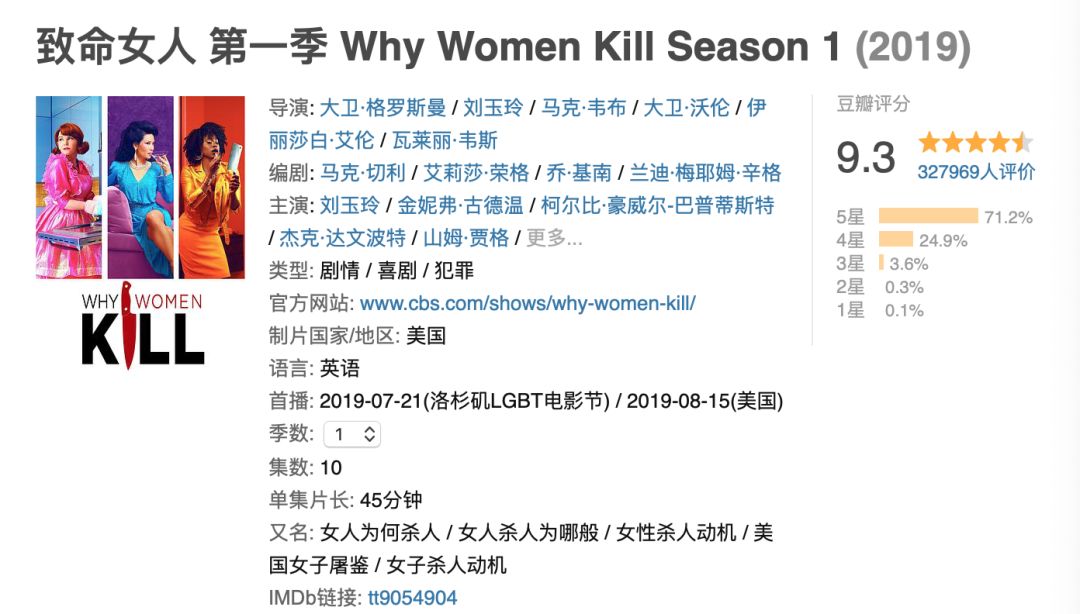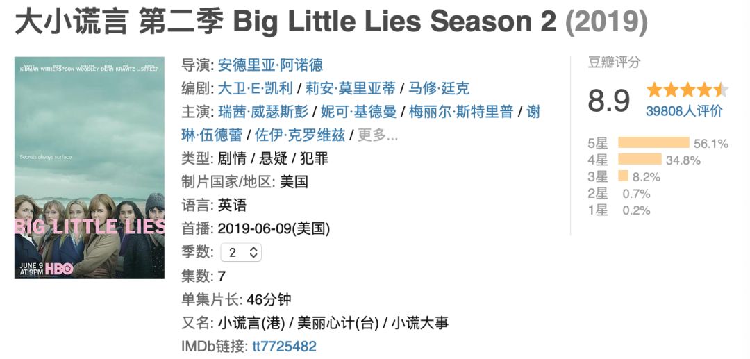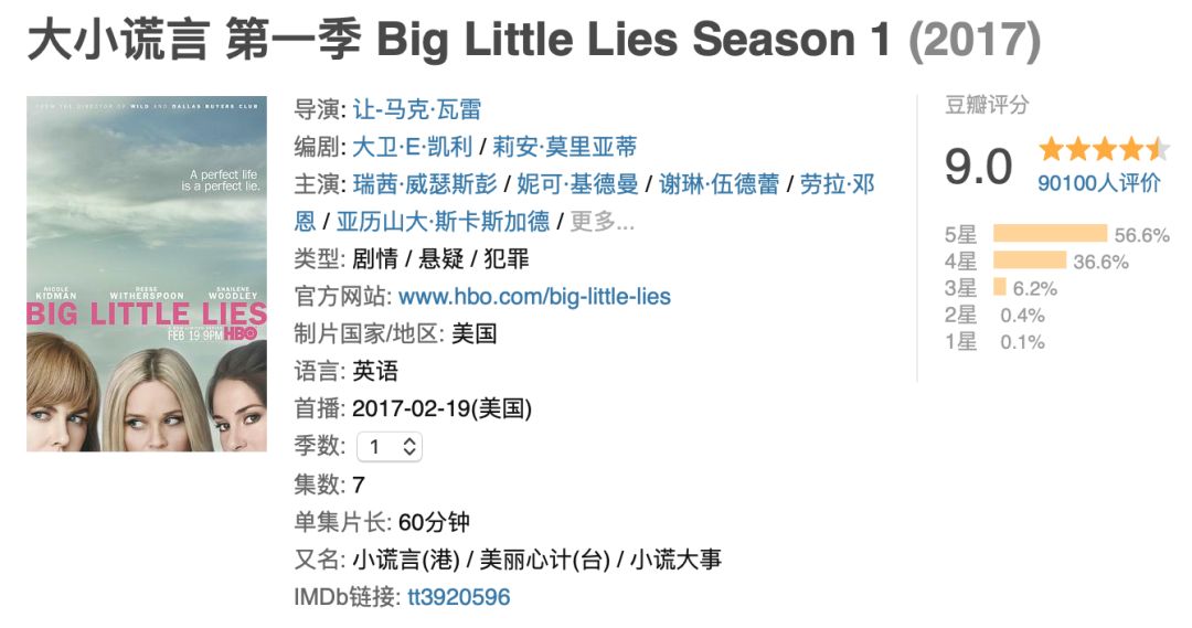 2、而另一部同样很推荐的剧情类爽剧就是《大小谎言》了,这个剧一共两季,第一季豆瓣9.0分,第二季豆瓣8.9分,
