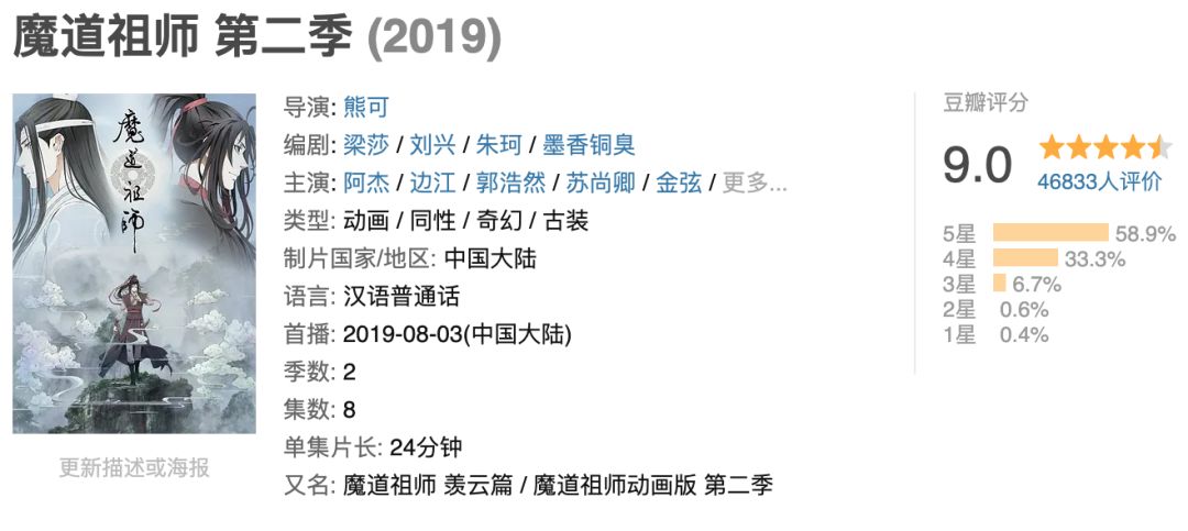 8、国产动画也有呢,那就是《魔道祖师》,去年正好第二季开播,9.0分。