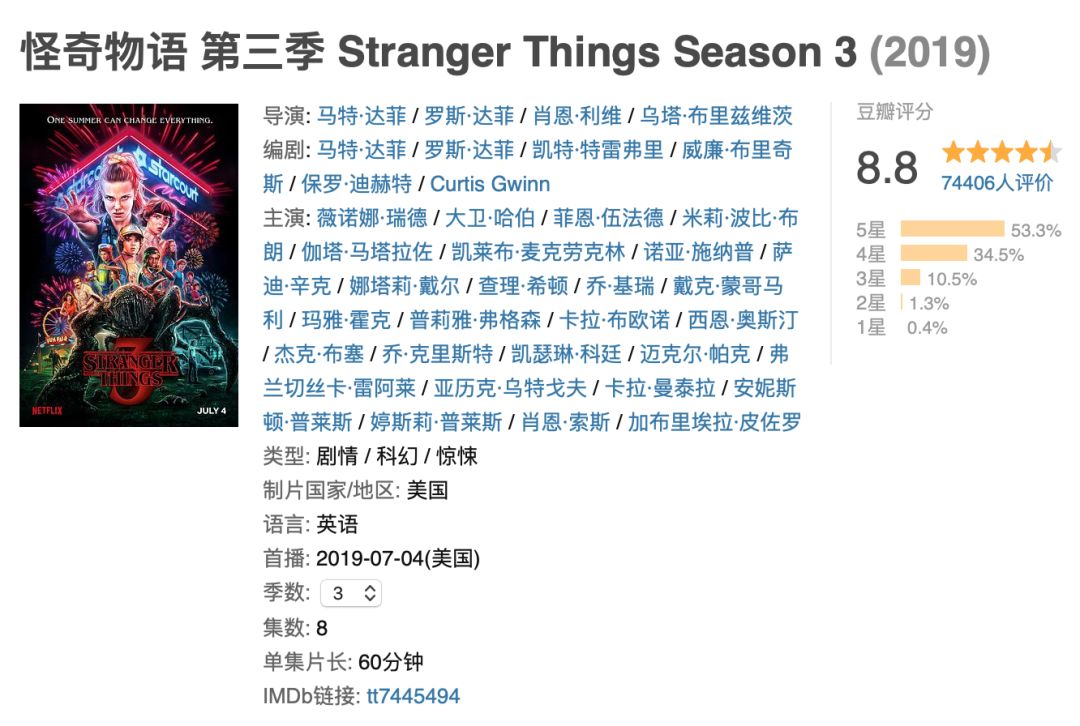 第三季去年也出了,仍然保持8.8分的高分,科幻惊悚加恐怖,又有80年代怀旧背景。