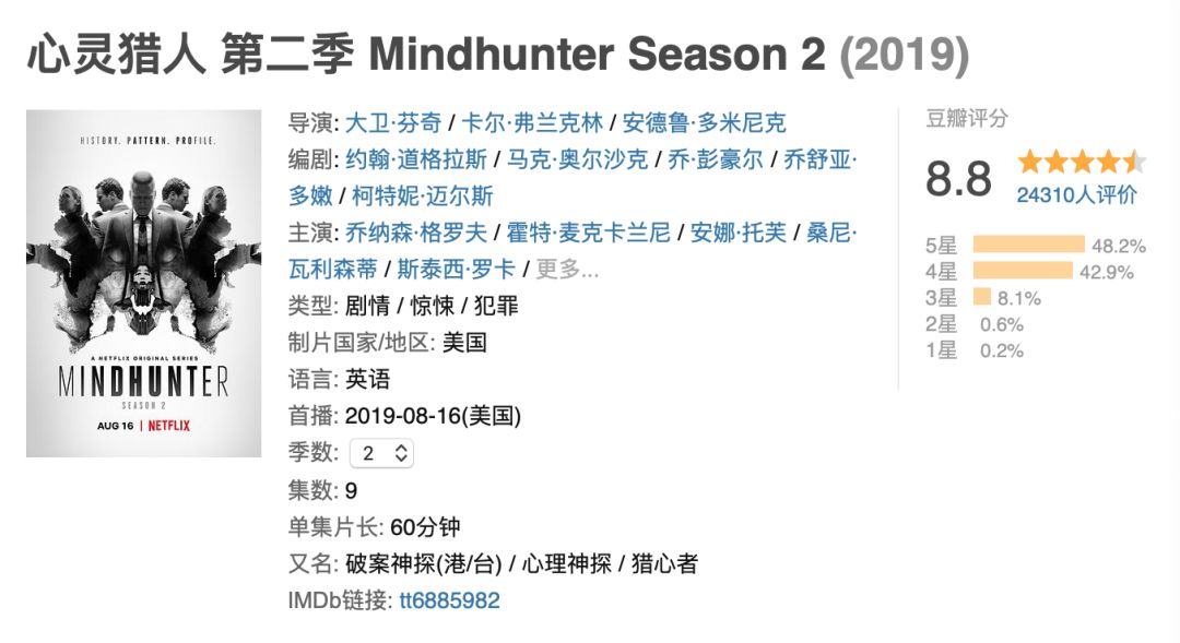 第一季8.9分,第二季8.8分,真实事件改编,连环杀人犯犯罪心理研究,也是很厉害了。详细推文【
