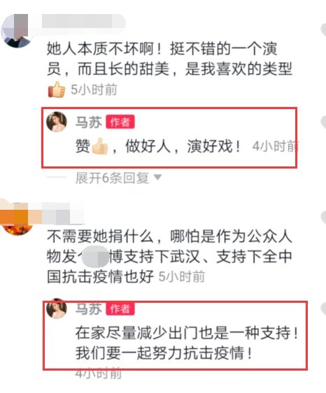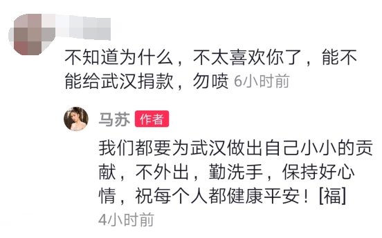 对于捐款的问题,某网友留言:不需要她捐什么,哪怕是公众人物发文支持武汉、支持一下全中国抗击疫情也好。马苏回应说:在家尽量减少出门也是一种支持,我们要一起努力抗击疫情。
