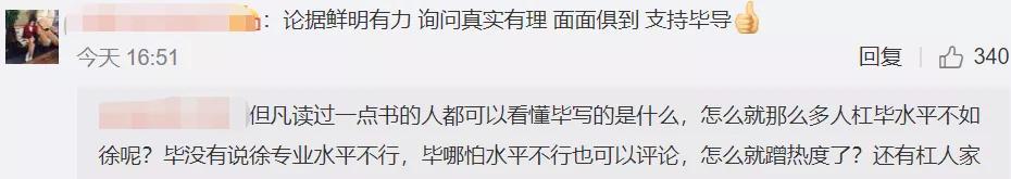 虽然毕志飞言语之间明显有针对之意,网友也认为毕志飞过于道德批判,但对比怒斥徐峥的毒舌与犀利,对上清华教授还真是客气了不少。