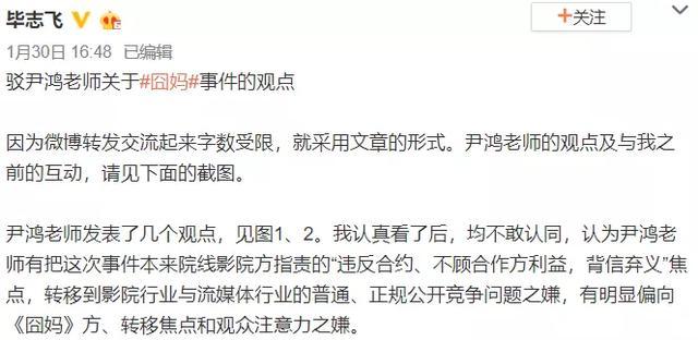 之后连续三天时间,毕志飞翻出不少旧料,质疑徐峥的能力及人品,不过徐峥却一直没有回应,毕志飞瞬间显得有些尴尬,只好开始了全网“狙击”,挖出清华大学新闻与传播学院教授尹鸿1月27日关于《囧妈》免费上线的看法。