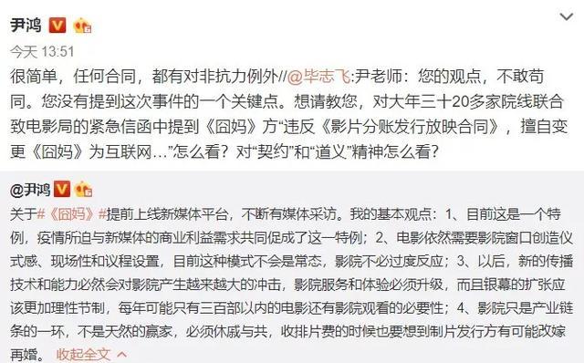 随后,毕志飞质问他对“契约”精神和“道义”精神怎么看。面对突然而来的质问,尹鸿教授也没有回复太多,只是简单说了一句,“任何合同都有非对抗力的例外。”,意思是《囧妈》与院线之间的契约,已经因为不可对抗力无效。