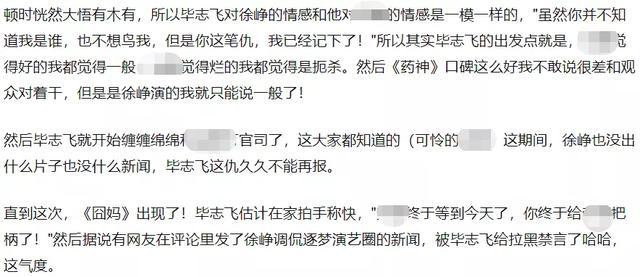 也有人继续吐槽毕志飞蹭热度,之前也有网友扒出,徐峥在导协大会上曾经当着国内一众大导的面嘲讽过毕志飞,公开发言表示做电影没门槛,门槛在导演心里,要是所有人都来做导演,导演就变成那部电影《逐梦演艺圈》了。