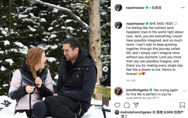 1月30日,世界首富比尔·盖茨的大女儿珍妮弗·盖茨(Jennifer Gates)通过社交网络发布喜讯,正式宣布与男友男友纳耶尔·纳萨尔( Nayel Nassar)订婚,并晒出了照片令人感