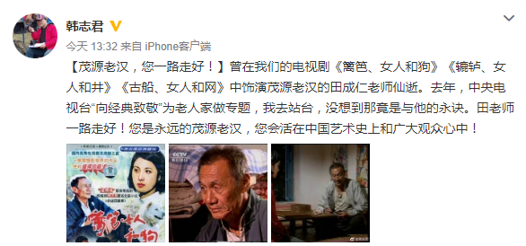 韩志君在文中称,“去年,中央电视台‘向经典致敬’为老人家做专题,我去站台,没想到那竟是与他的永诀。田老师一路走好!您是永远的茂源老汉,您会活在中国艺术史上和广大观众心中!”