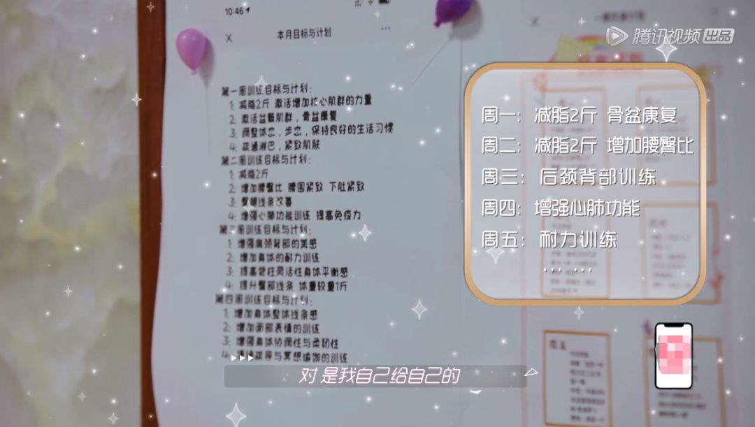 表格的详尽程度宛如考前计划,时间精确到分钟。除了每日计划,她还制定了一周计划:周一减脂2斤,骨盆康复;周二减脂2斤,增加腰臀比:周三后颈背部训练…
