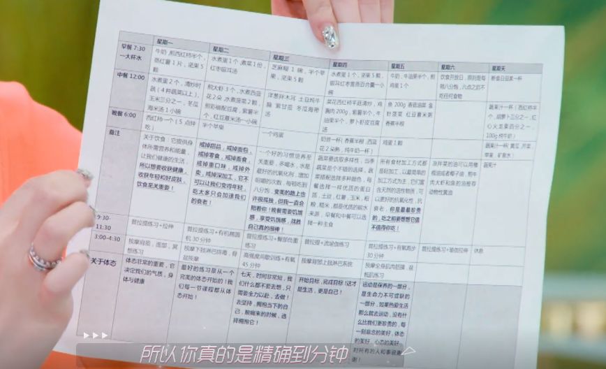 工作不多的时候,她会强迫自己一定要在某个时间睡觉,某个时间清醒,然后严格地按照表格饮食、护肤、运动。