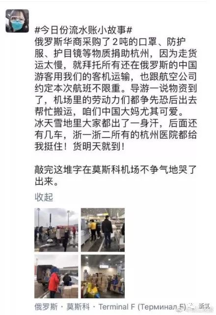 2吨医疗物资从俄罗斯由旅行团人肉“闪送”回杭,送往医院。这次中国大妈发挥了以往抢货搬货能力,冰天雪地里累出了一身汗。