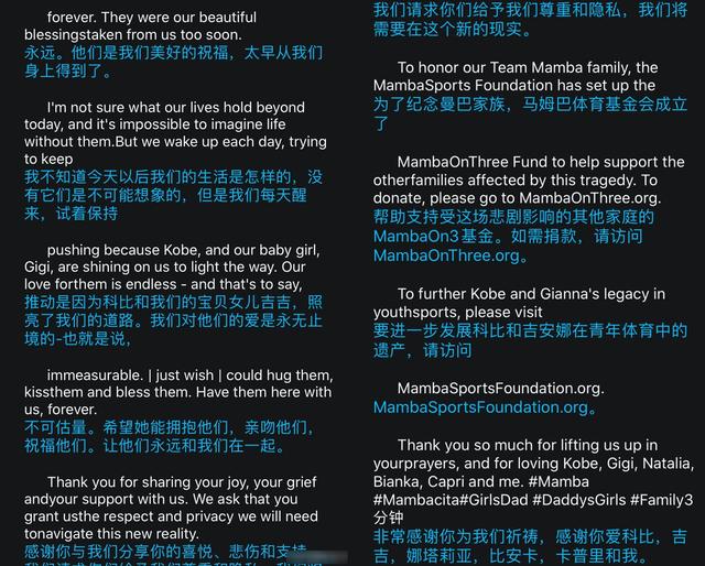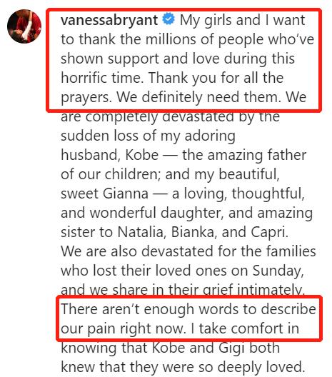 甚至表示:“我不知道我们的生活在今天之后会是什么样子,没有他们的生活是不可能想象的。”但另一方面也为了科比努力前进,知道自己的女儿们还需要她。除了表达悲痛的心情,瓦妮莎也向大家传达了感谢,并请求给予足够的尊重和保护我们的隐私,以尊重曼巴家族。