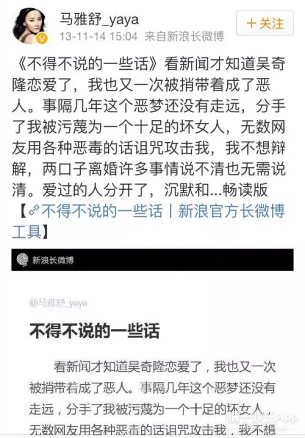 这边公布恋情,那边就有人开扒马雅舒和吴奇隆的前尘往事,为此马雅舒还特意发了一篇长微博▼