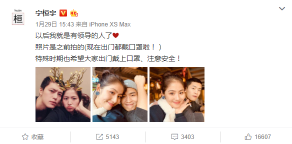 1月29日,2013届快男宁桓宇在社交平台晒出与女友合照甜蜜公布恋情,他发文称:“以后我就是有领导的人了。照片是之前拍的(现在出门都戴口罩啦!)特殊时期也希望大家出门戴上口罩、注意安全!”