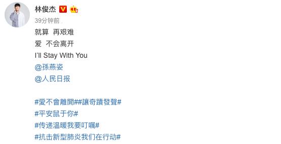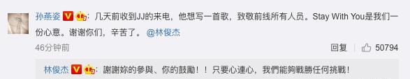 林俊杰则回复:"只要心连心,我们能够战胜任何挑战",非常鼓舞人心。