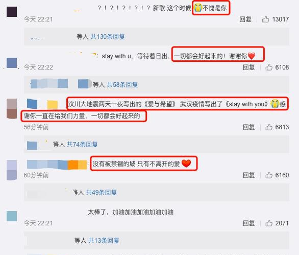 网友们纷纷表示,"不愧是林俊杰",汶川大地震的时候他就曾在两天一夜内写出《爱与希望》,这次武汉受肺炎疫情影响又写出了《STAY WITH YOU》这首歌。大家都非常感谢他"一直在给我们力量"。