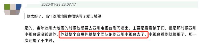 还有网友提起,汶川大地震的时候,四川电视台因为没钱请他,他就自费带着团队到四川电视台去演出。那一次,他还捐了不少钱。