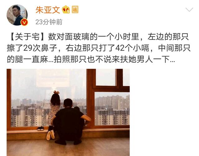 1月28日,大年初四,朱亚文分享了与两个女儿的同框照,并配文说道:关于宅,数对面玻璃的一个小时里,左边的那只擦了29次鼻子,右边那只打了42个小嗝,中间那那只的腿一直麻……拍照那只也不说来扶她男人一下……
