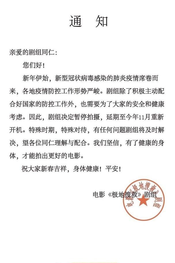 据香港媒体报道 甄子丹主演的电影《极地搜救》于去年尾于长白山开机,至农历年剧组放了三日假后,原定于大年初三复工,甄子丹亦开始入剧组开工,不过投资方星皓电影有感武汉肺炎疫情严重,为大众安全及健康着想,剧组决定宣布暂停拍摄,并延期至今年11月再重新开
