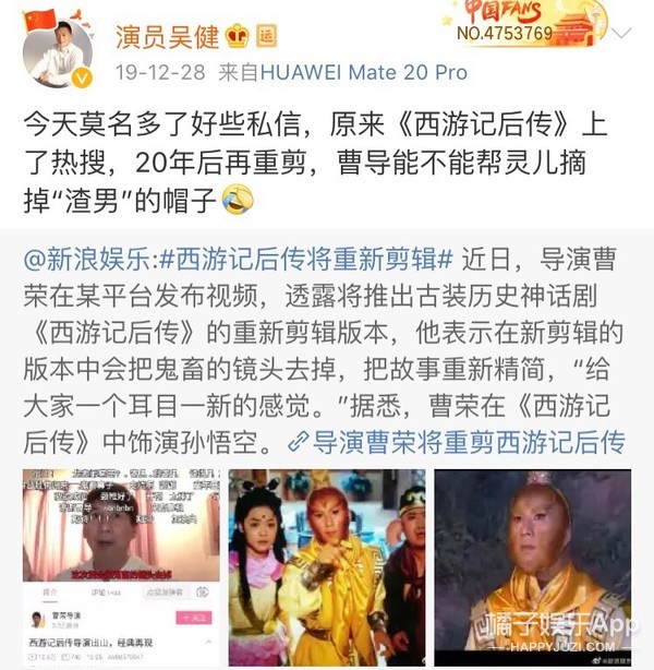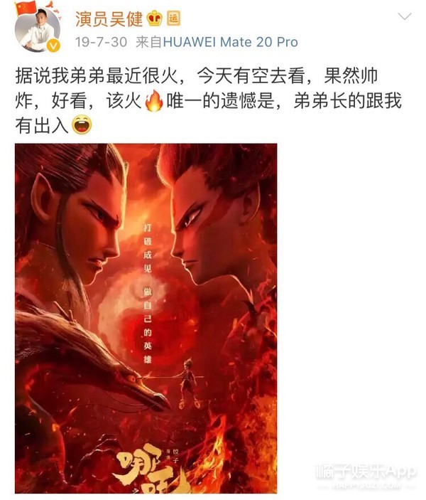 他在《欢天喜地七仙女》里演过金吒,看完《哪吒之魔童降世》发了微博 。