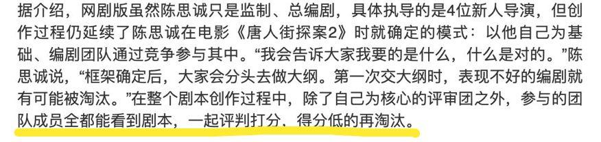 当然啦,有这样的效果,并非陈思诚化“裁缝”为才华,而是他组了个编剧赛。在确定故事框架后,让几十位编剧先分头去写大纲,如表现不好就会被淘汰,接着,再进行下一轮比赛,再淘汰,再比赛,再淘汰……陈思诚自己说,这样的赛制后,最后的剧本已经超过了他的想象,现在他的团队有二十六七个编剧。