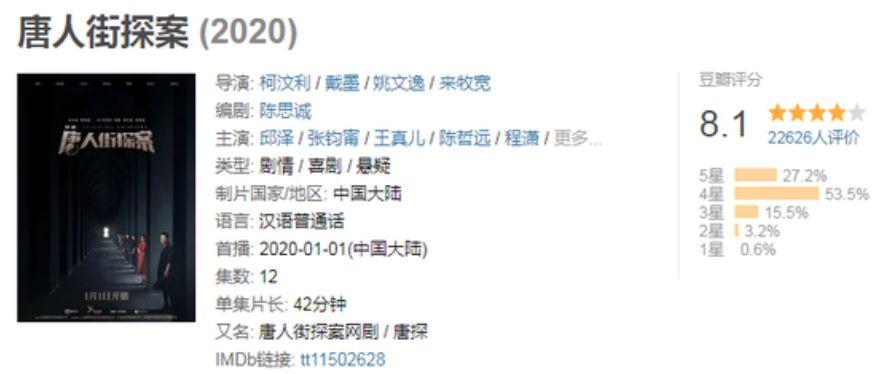 由此,我“合理”断定,《唐人街探案》的网剧版依然得不了高分。只是,正当我琢磨它到底会在3-4分,还是4-5分的时候,它给我们所有人上演了一个“哪吒式”的反转,不仅突破了及格线,甚至还一度超越了影版达到了8.1分。