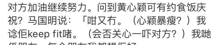 媒体问及马国明怎样看待黄心颖暴瘦,他的回复也很得体:“我想她只是在健身减肥吧。”