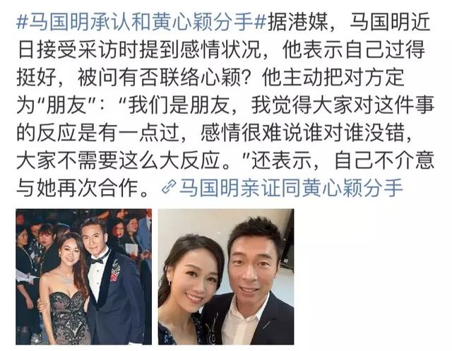 刚承认分手不久后接受采访,马国明表示“感情的事很难说谁对谁没错”,不介意与黄心颖再次合作。
