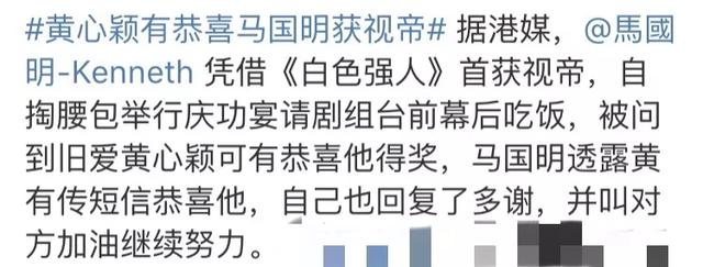 台前的马国明获奖后风光无限,被问起他台下有没有收到前女友黄心颖的祝福,他还大方表示对方有传短信恭喜自己,自己也叫她加油继续努力。