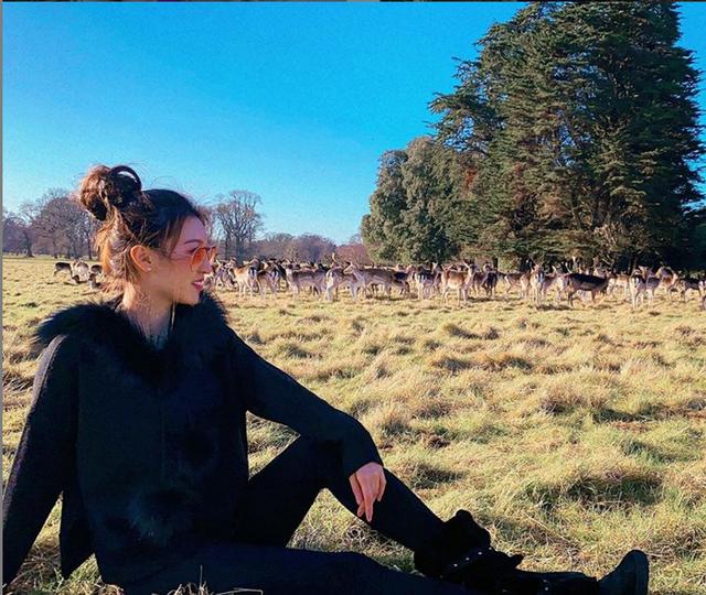 何艳娟一身黑色look,坐在草坪上,与远处的小动物合影,扎着丸子头,墨镜加面的她看着很是减龄,说到底她也才28岁,不要穿得太“富贵”,看着也很是年轻有活力的。