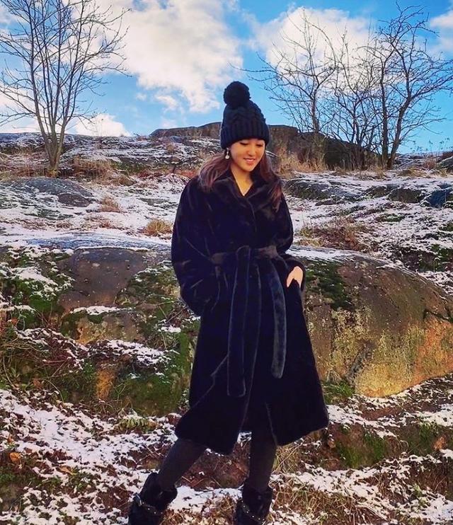 最新一站,何艳娟去到了芬兰,只见她身穿黑色浴袍式皮草,头戴针织帽,大凹造型拍美照,这身材、这景色的确怎么拍都很美。